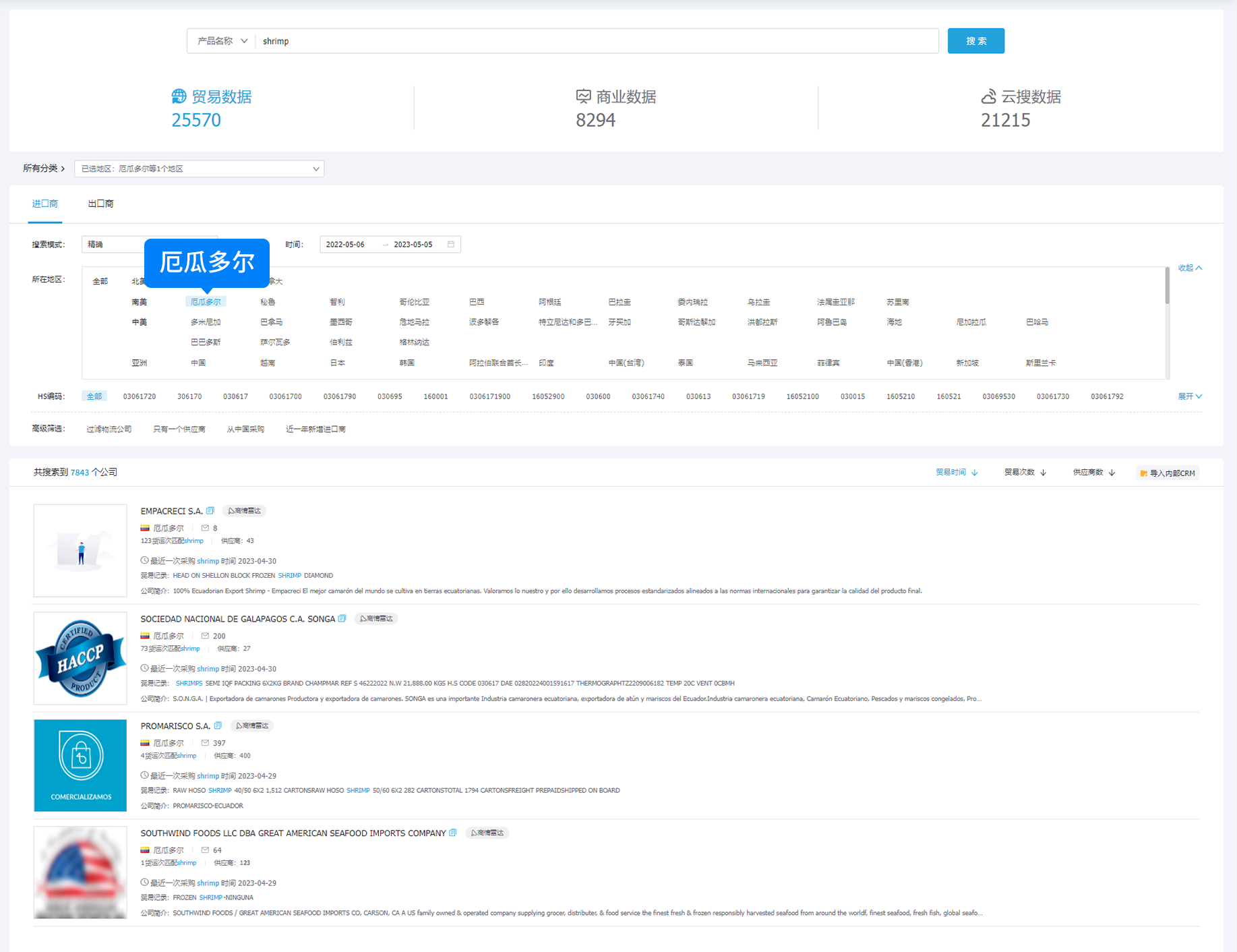 在【商情发现】搜索框中输入"产品关键词"、"HS编码""公司名称"、"SCI编码"等条件查询,可看到"对该产品有采购需求"的全部国外采购商;国家选择"厄瓜多尔",可看到"对产品有采购需求"的厄瓜多尔采购商。