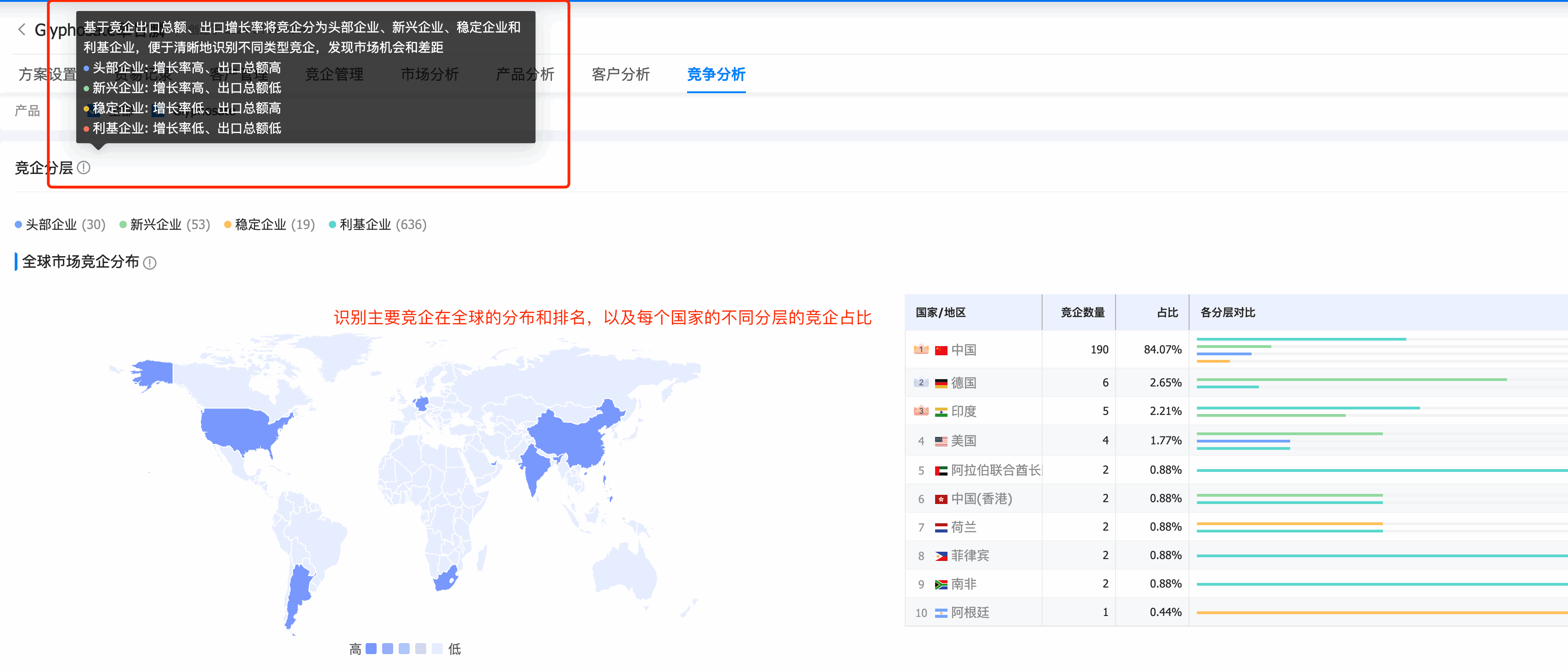 2. evo真人视讯商情洞察市场分析模块新增「竞争分析」模块,分析目标产品全球竞争格局,其中: