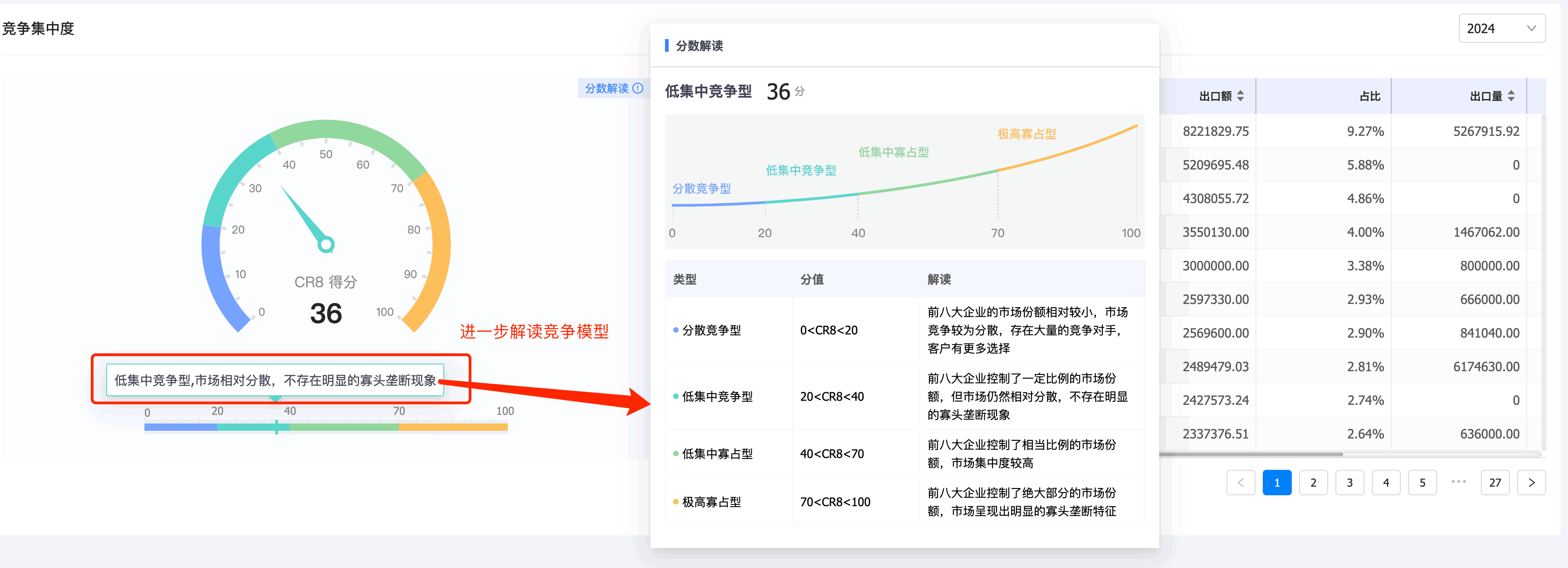 3. evo真人视讯商情洞察竞争分析新增「竞争集中度分析」:基于行业集中度(Concentration Ratio)理论来计算目标产品竞企竞争集中度,出口目标产品前8家最大的企业所占市场份额的总和,是对整个竞争市场结构集中程度的测量指标