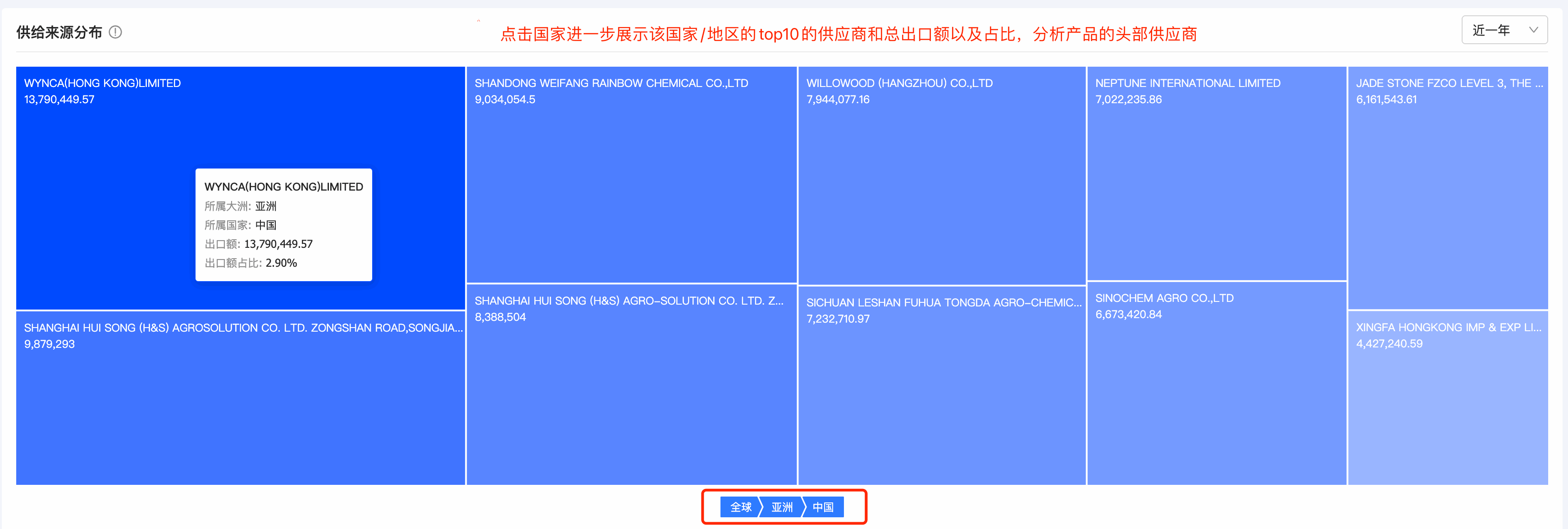 竞企分层明细直观地展现了各个分层的集中度,右边列表详细罗列了各个竞企的分层标签、所属国家、供应金额、供应增长率