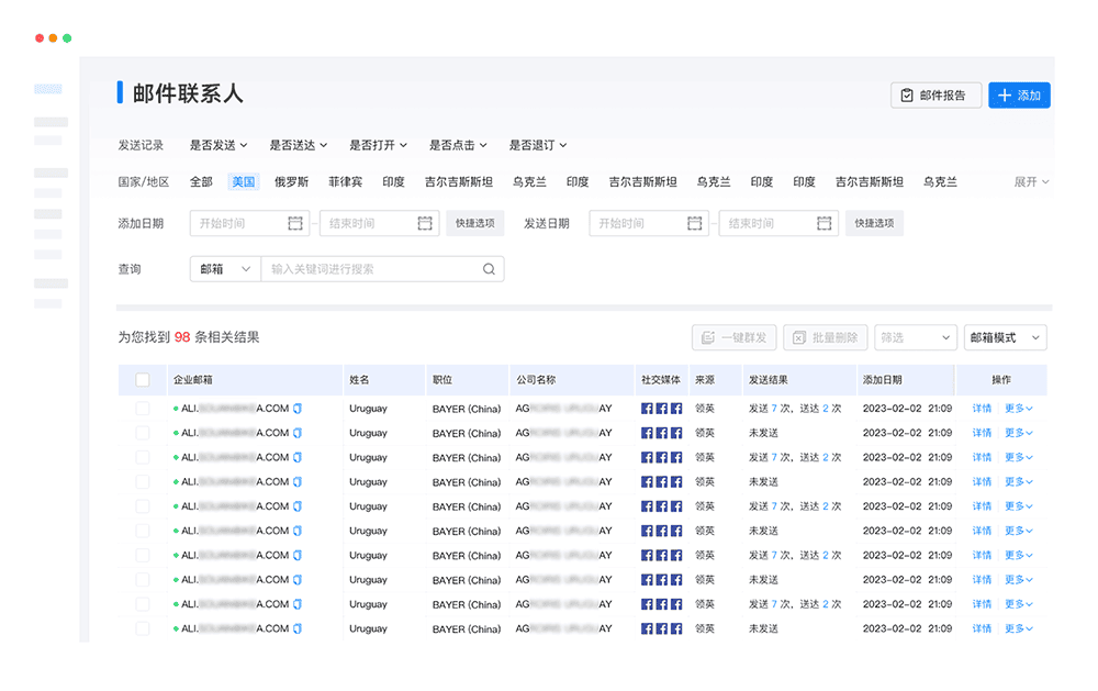 涵盖电话、邮箱、社媒等多渠道联系人信息,并顺利获得evo真人视讯云邮通及其他工具一键触达采购决策人,进行外贸找客户。