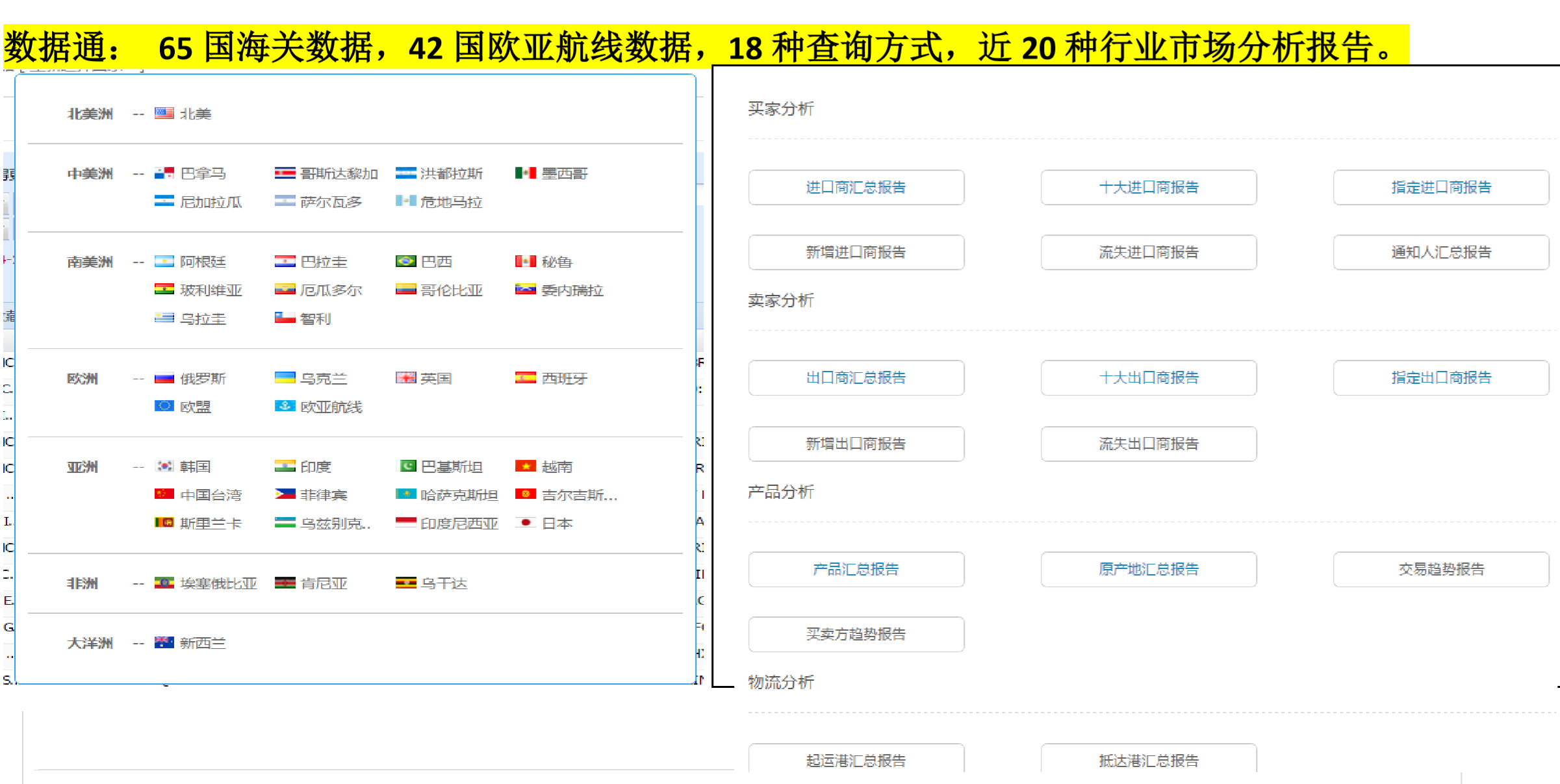 evo真人视讯海关数据库,实时给予全球涵盖65国海关数据,42国欧亚航线数据,100+亿实时贸易数据,定位1.8亿全球企业信息,帮助您分析全球市场贸易趋势及分布,为您的产品快速、精准、科学地锁定热销国家和新兴市场。